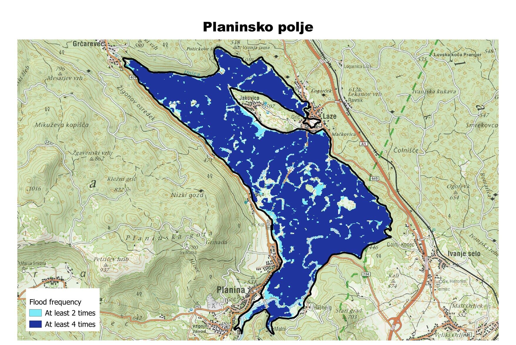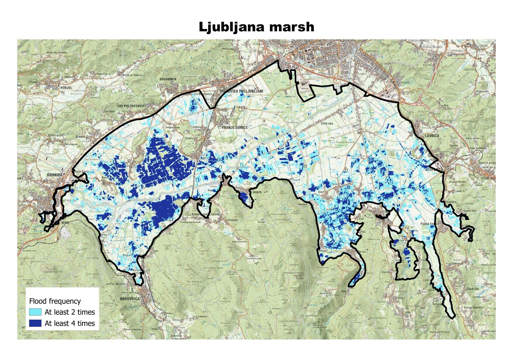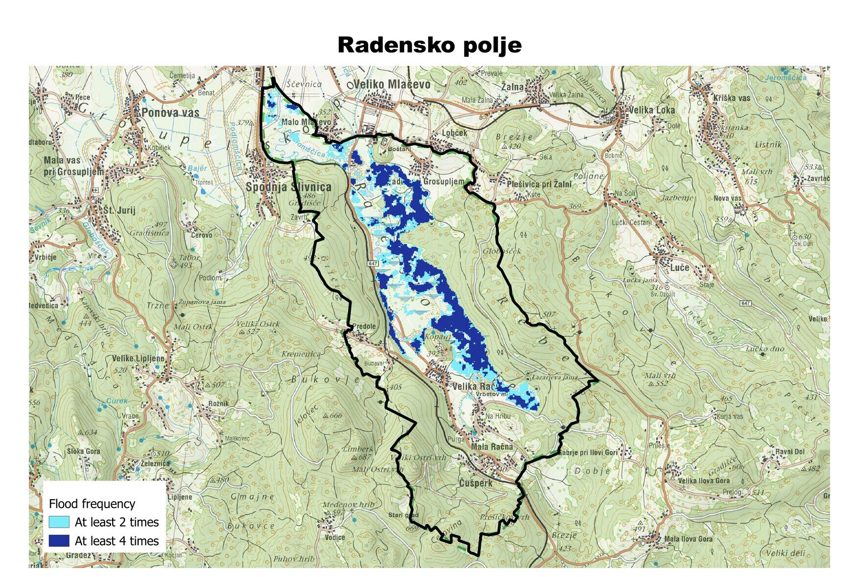 Flood frequency mapping was applied to Radensko polje, Planinsko polje, and the Ljubljana marsh. The results support transparent differentiation between occasional and frequently flooded land, enabling more consistent land classification and improved decision-making.